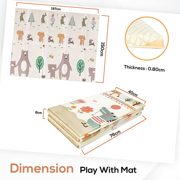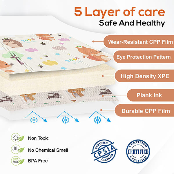This portable baby play mat is suitable for indoor and outdoor use, making it ideal for any play area at home or in public places. Our folding play mat can also be used in the office, or for yoga and exercise. Be careful not to put heavy objects with sharp angles on the carpet.